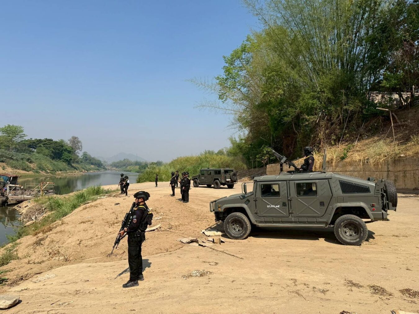 ที่บริเวณริมแม่น้ำเมยชายแดนไทย-เมียนมา เจ้าหน้าที่ทหารพราน ชุดเคลื่อนที่เร็ว หน่วยเฉพาะกิจกรมทหารพรานที่ 35 บูรณาการสนธิกำลังร่วมกับ กองร้อยทหารพรานที่ 3501 และกองร้อยทหารพรานที่ 3507 ลาดตระเวนเฝ้าตรวจ/เคลื่อนไหวแสดงกำลังในพื้นที่ตามแนวชายแดน เพื่อป้องกัน ปราบปราม และสกัดกั้นการลักลอบนำเข้า – ส่งออกน้ำมันเชื้อเพลิง