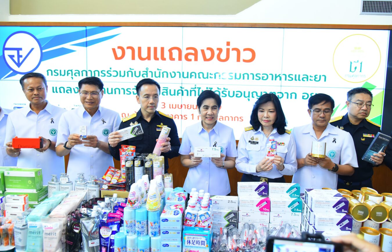 นายพันธ์ทอง ลอยกุลนันท์ อธิบดีกรมศุลกากร พร้อมด้วย เภสัชกรหญิง สุภัทรา บุญเสริม เลขาธิการคณะกรรมการอาหารและยา ร่วมแถลงข่าว ณ อาคาร 1 กรมศุลกากร เผยผลสำเร็จจากการบูรณาการความร่วมมือในการตรวจยึดสินค้าไม่ได้รับอนุญาตจาก อย. อย่างต่อเนื่อง