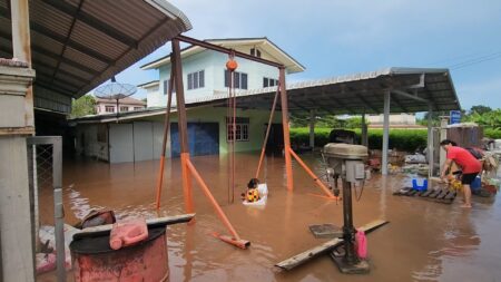 พนังกั้นน้ำแม่น้ำน่านแตกไหลทะลักท่วมชุมชนตะพานหิน 200 หลัง