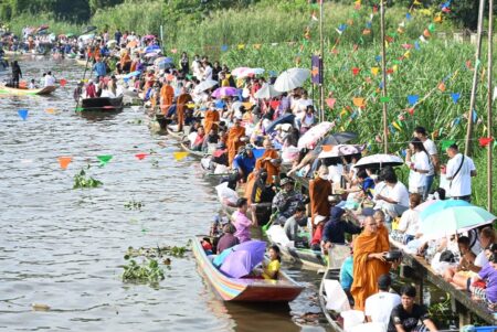 คึกคัก! ลาดกระบังจัดตักบาตรพระร้อยทางเรือสืบสานวิถีมอญคู่คลองลำปลาทิว