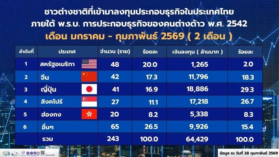 เฉพาะเดือนกุมภาพันธ์ 2569 มีการอนุญาตให้ต่างชาติประกอบธุรกิจ 130 ราย มูลค่าการลงทุน 30,650 ล้านบาท โดยนักลงทุนส่วนใหญ่มาจาก สหรัฐอเมริกา จีน และญี่ปุ่น