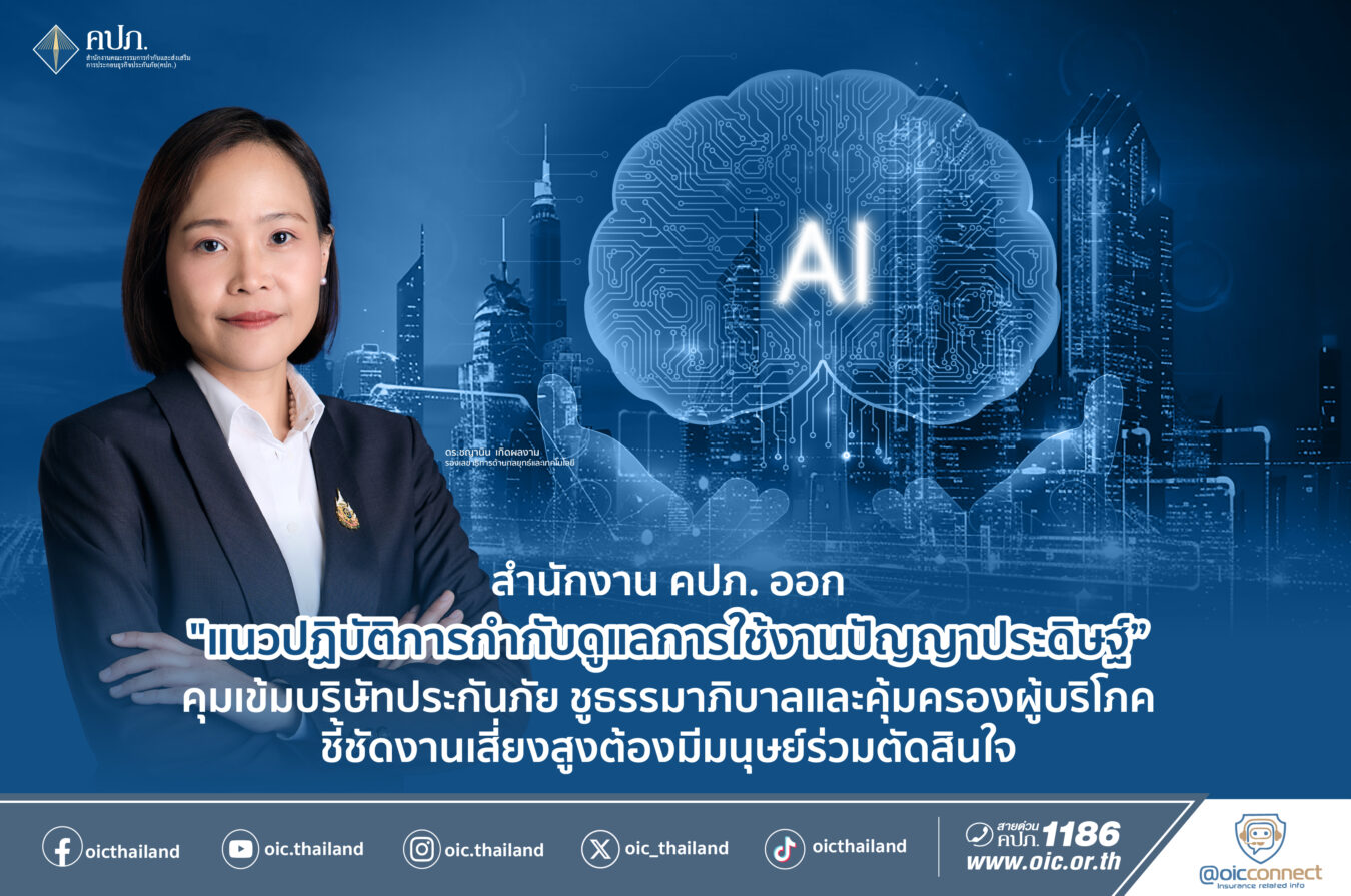 การเผยแพร่แนวปฏิบัติฉบับนี้ ถือเป็นก้าวสำคัญของสำนักงาน คปภ. ในการยกระดับมาตรฐานการกำกับดูแลเทคโนโลยี ให้เท่าทันพัฒนาการในยุคดิจิทัล โดยมุ่งให้กฎเกณฑ์ไม่เป็นอุปสรรคต่อการนำนวัตกรรมมาใช้ แต่เป็นกลไกส่งเสริมนวัตกรรม อย่างรับผิดชอบ (Responsible Innovation) ที่ช่วยสร้างความเชื่อมั่นให้แก่ประชาชน ควบคู่กับการเสริมเสถียรภาพของ ระบบประกันภัยไทยในระยะยาว ผู้สนใจสามารถดาวน์โหลดเอกสาร แนวปฏิบัติการกำกับดูแลการใช้งานปัญญาประดิษฐ์ สำหรับบริษัทประกันภัย (AI Governance Guideline) พ.ศ. 2568 ได้ที่ https://www.oic.or.th/th/rm-survey/