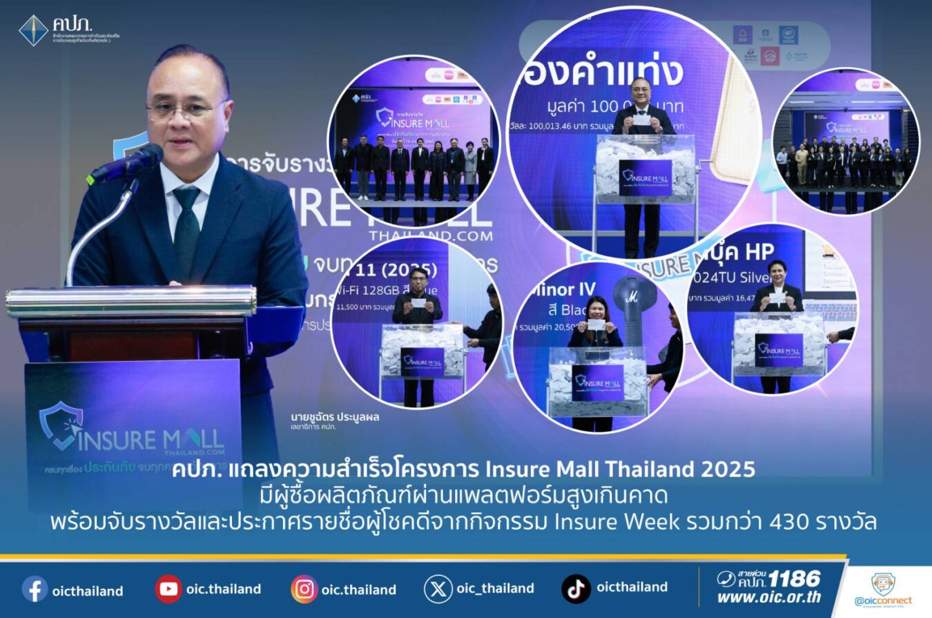 สำนักงาน คปภ. ขอแสดงความยินดีกับผู้โชคดีที่ซื้อผลิตภัณฑ์ประกันภัยในช่วงกิจกรรม Insure Week ผ่านเว็บไซต์ Insure Mall Thailand ระหว่างวันที่ 8 – 21 ธันวาคม 2568 ที่ผ่านมา ที่ได้รับสิทธิ์ลุ้นรางวัลใหญ่มูลค่ารวมกว่า 6 แสนบาท อาทิ ทองคำแท่ง และ iPhone 17 Pro รวมทั้งรางวัลอื่น ๆ อีกมากมาย รวมแล้วมากกว่า 430 รางวัล พร้อมกันนี้ ขอขอบคุณประชาชน ตลอดจนพันธมิตรและบริษัทประกันภัยที่ให้ความสนใจ และร่วมเป็นส่วนหนึ่งของความสำเร็จของโครงการ
