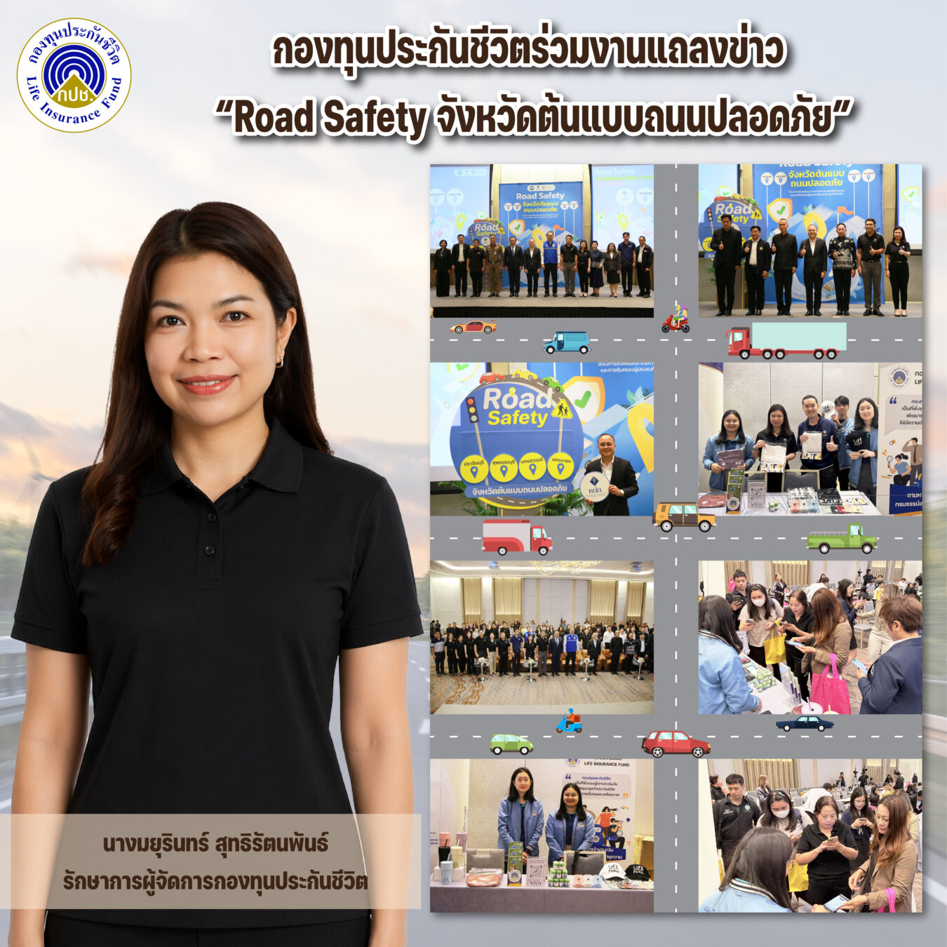 ในการนี้ กองทุนประกันชีวิตได้ร่วมเป็นเครือข่ายสำคัญในการสนับสนุนภารกิจเชิงรุกเพื่อสร้างความเชื่อมั่นในระบบประกันภัยให้แก่ประชาชน โดยร่วมจัดบูธกิจกรรมประชาสัมพันธ์บทบาทหน้าที่ของกองทุนฯ พร้อมให้บริการตรวจสอบสิทธิเงินกรมธรรม์ล่วงพ้นอายุความ ซึ่งเป็นสิทธิประโยชน์สำคัญที่ประชาชนอาจละเลย เพื่อเป็นการคุ้มครองสิทธิประโยชน์ของผู้เอาประกันภัยและสร้างหลักประกันความมั่นคงในชีวิต การเข้าร่วมกิจกรรมในครั้งนี้ไม่เพียงแต่เป็นการเผยแพร่ความรู้ด้านการประกันชีวิต แต่ยังเป็นการเชื่อมโยงความปลอดภัยทางถนนเข้ากับการวางแผนชีวิตที่ยั่งยืน เพื่อมุ่งเป้าสู่การเป็นชุมชนต้นแบบถนนปลอดภัยทั่วประเทศในอนาคต