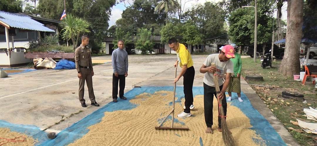 เมื่อวันที่ 19 พ.ย.2568 ผู้สื่อข่าวรายงานว่า ที่บริเวณลานหน้า สภ.โคกกระชาย อ.บ้านกรวด จ.บุรีรัมย์ ซึ่งเป็นโรงพักที่อยู่บริเวณแนวชายแดนไทย-กัมพูชา พบชาวบ้านในพื้นที่ ซึ่งได้ทำการเก็บเกี่ยวผลผลิตข้าวเปลือกนาปี บางรายทยอยนำข้าวเปลือกที่เก็บเกี่ยวเสร็จแล้ว นำมาผึ่งตากแดดไล่ความชื้น ยังบริเวณลานปูนซีเมนต์หน้า สภ.โคกกระชาย โดยมี พ.ต.ท.ไกรสิทธิ์ หาญยิ่ง สารวัตรใหญ่(สวญ.สภ.โคกกระชาย) และข้าราชการตำรวจคอยอำนวยการสะดวก และช่วยเหลือชาวนาตากข้าว เป็นภาพที่ประทับใจอย่างยิ่ง