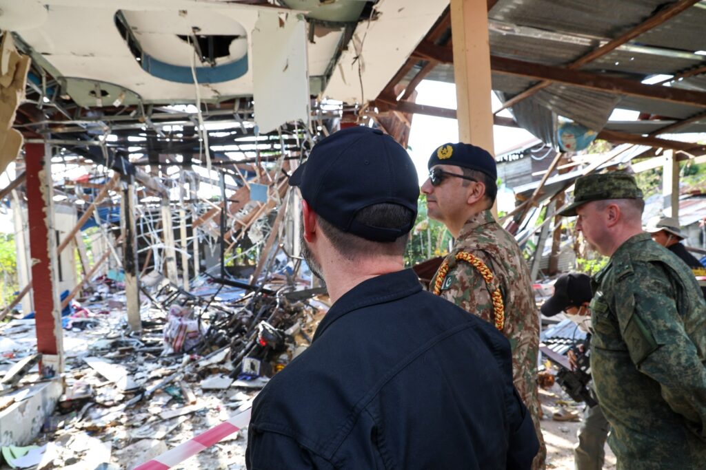 ภายหลังการรับฟังบรรยายสรุป คณะผู้ช่วยทูตทหารได้ลงพื้นที่ตรวจสอบความเสียหายบ้านเรือนประชาชนในหมู่บ้านหนองเม็ก ต.เสาธงชัย อ.กันทรลักษ์ ซึ่งถูกกระสุนปืนใหญ่ตกใส่จนได้รับความเสียหายหลายหลัง เพื่อรับทราบผลกระทบต่อพลเรือนจากเหตุปะทะตามแนวชายแดนไทย–กัมพูชา