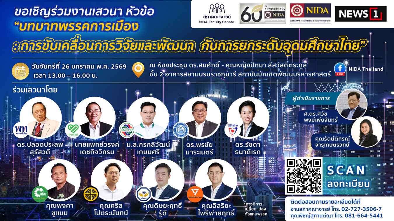 กรุงเทพมหานคร – สภาคณาจารย์ สถาบันบัณฑิตพัฒนบริหารศาสตร์ (NIDA) ขอเชิญชวนผู้สนใจเข้าร่วมรับฟังการเสวนาทางวิชาการครั้งสำคัญในหัวข้อ “บทบาทพรรคการเมืองและการขับเคลื่อนการวิจัยและพัฒนา กับการยกระดับอุดมศึกษาไทย” เพื่อร่วมหาทางออกและกำหนดทิศทางให้อุดมศึกษาไทยก้าวทันความเปลี่ยนแปลงของโลก ผ่านมุมมองและนโยบายของพรรคการเมืองชั้นนำ